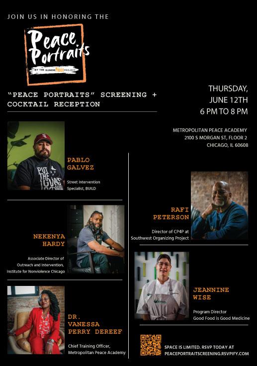 Join us for a screening and cocktail reception on Thursday, June 12, 2025 from 6-8 p.m., at the Metropolitan Peace Academy at 2100 S Morgan St, Floor 2, to celebrate our five “Peace Portraits” honorees!