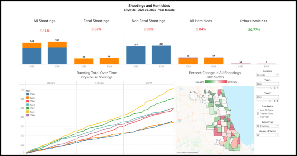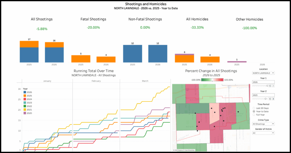 While North Lawndale is only seeing a slight overall decrease in shootings and homicides for 2026, the area is still outperforming citywide numbers as a whole, which are up a few percentage points. Year to date, Chicago has seen a 4.4% increase in all shootings, compared to North Lawndale, which has seen a 5.8% decrease in all shootings.